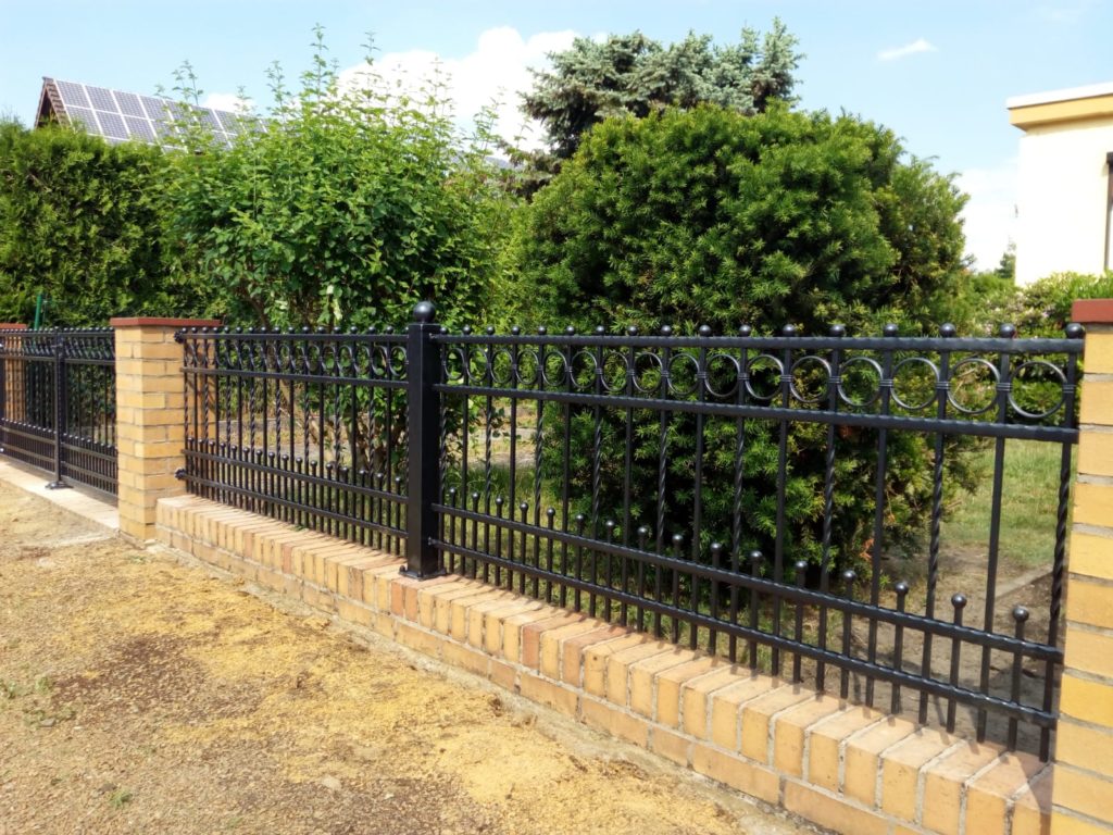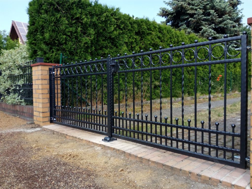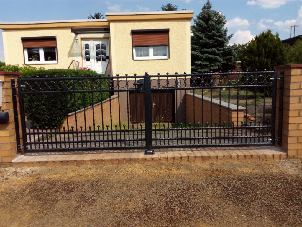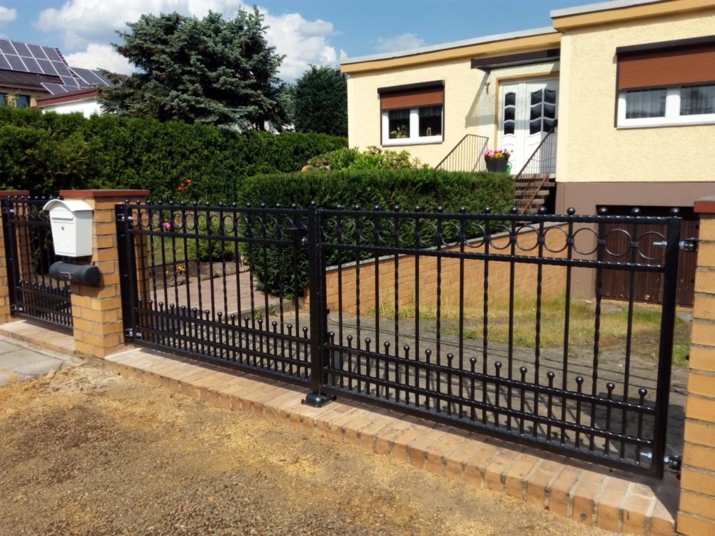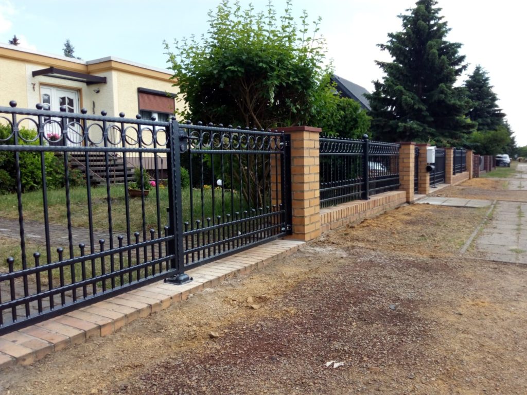 Es ist hier zu bemerken, dass es bei uns keine Standardgrößen gibt. So sind z. B. im Fall dieser konkreten Anlage die Zaunfelder rechts 81,5 cm hoch und links 83,5 cm hoch, ein Tor ist 98 cm hoch und das andere 1,02 m hoch. Alles wurde so gemacht, dass alle Elemente eine gerade Linie oben bilden und dass der Abstand zwischen der Unterkante der Anlage und der Ebene des vorhandenen Sockels sinnvoll und möglicherweise überall gleich ist. Auch die Breiten sind auf diese Weise den Wünschen und Bedürfnissen des Kunden angepasst, z. B. ist ein der Tore 3,39 m breit und das andere 3,25 m breit.