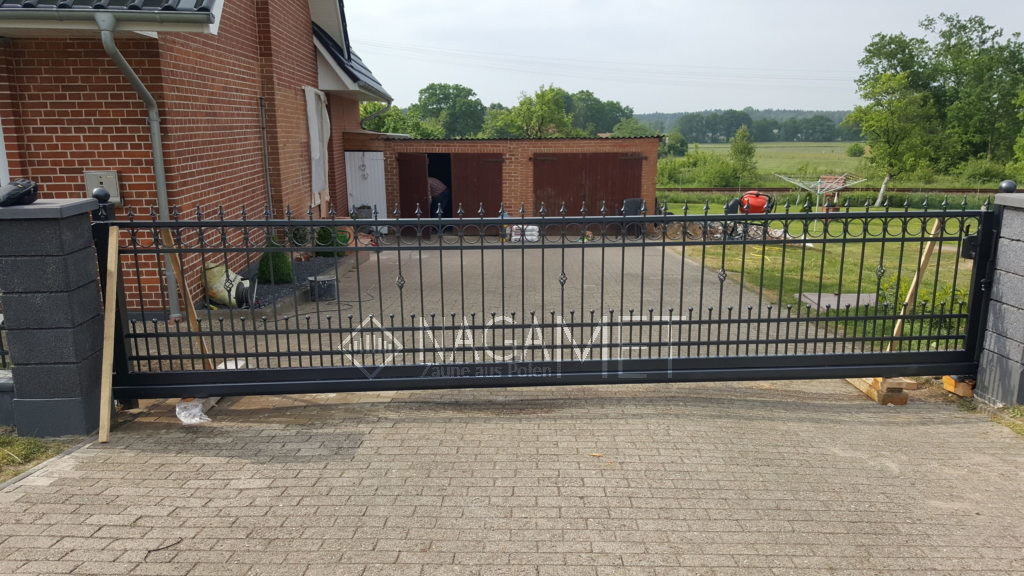 Die Gesamtlänge der Anlage beträgt 28 Meter. Es gibt hier ein 5,60 m breites Schiebetor (ohne Antrieb) und eine Pforte dabei. Die Höhe beträgt 1,20 m.