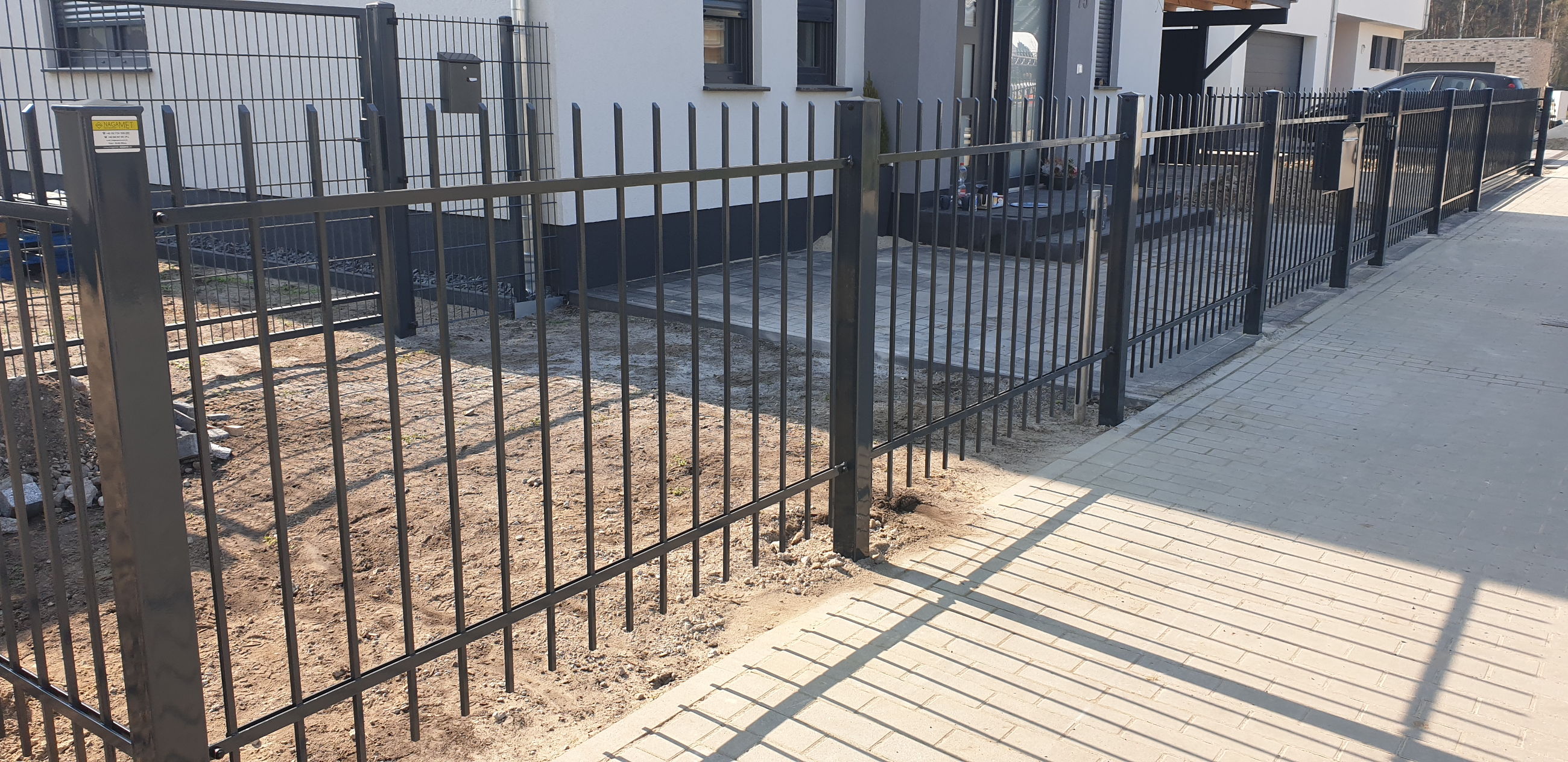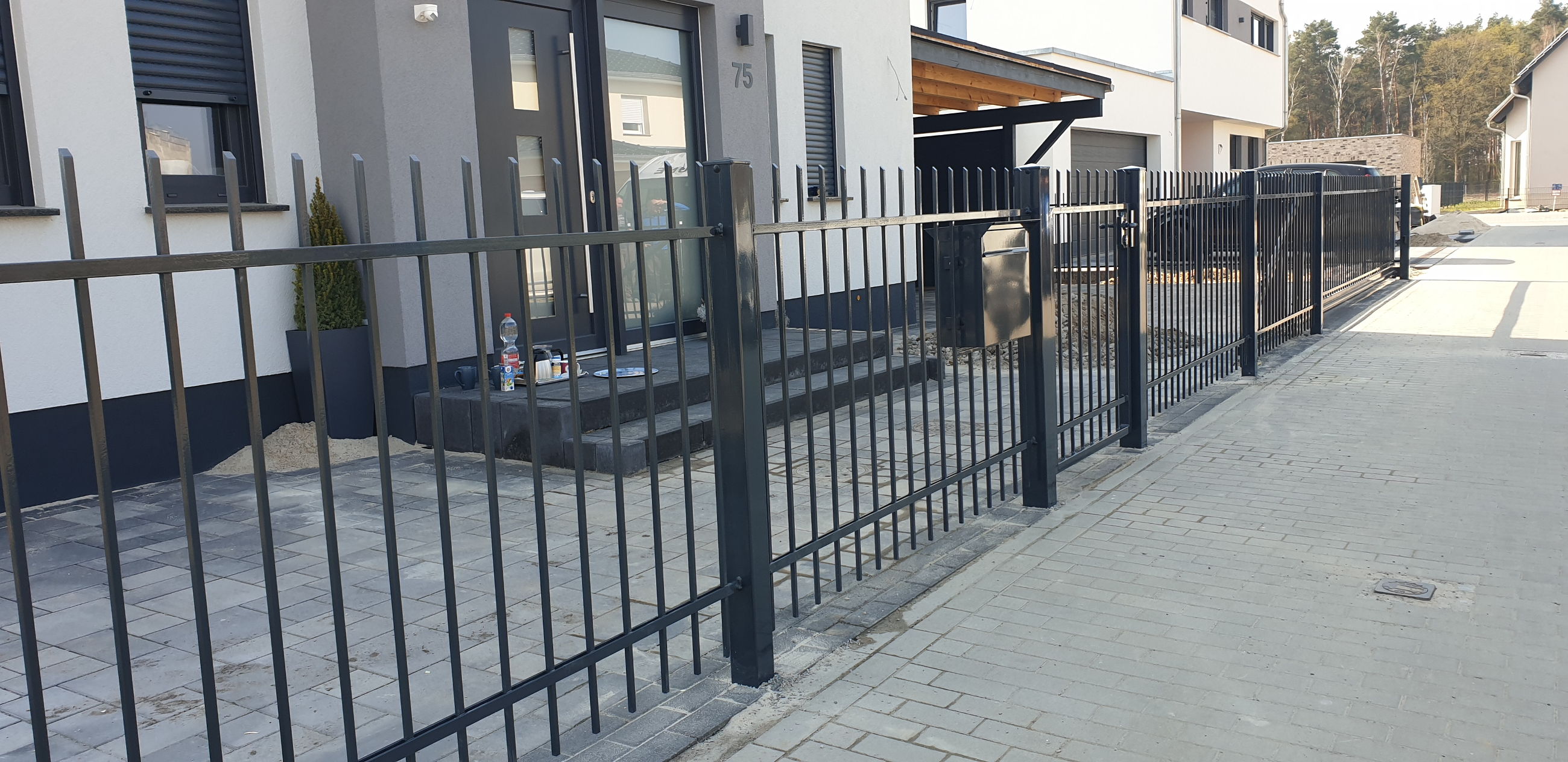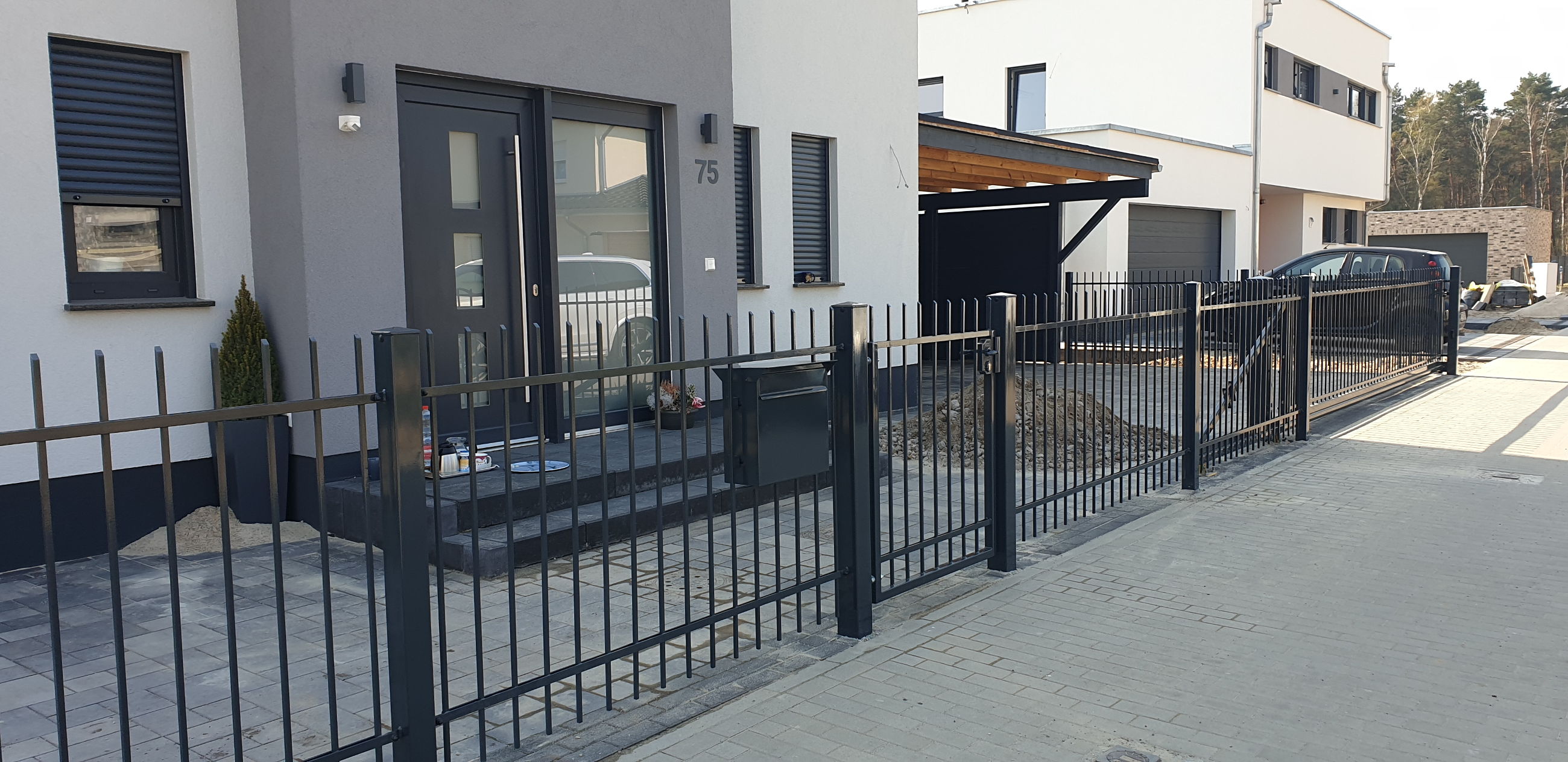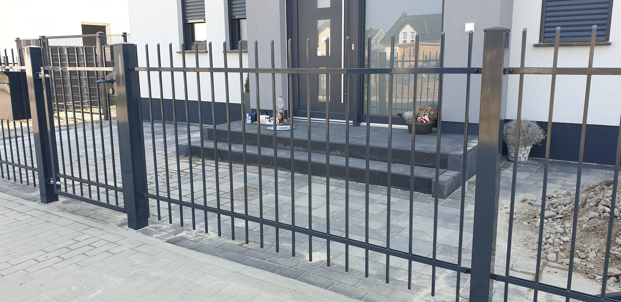 Das von den Kunden gewähte sehr schlichte Muster (gerade vertikale Stäbe, horizontale Flacheisen, Pfosten mit Pyramiden) eignet sich perfekt zum modernen Neubau.