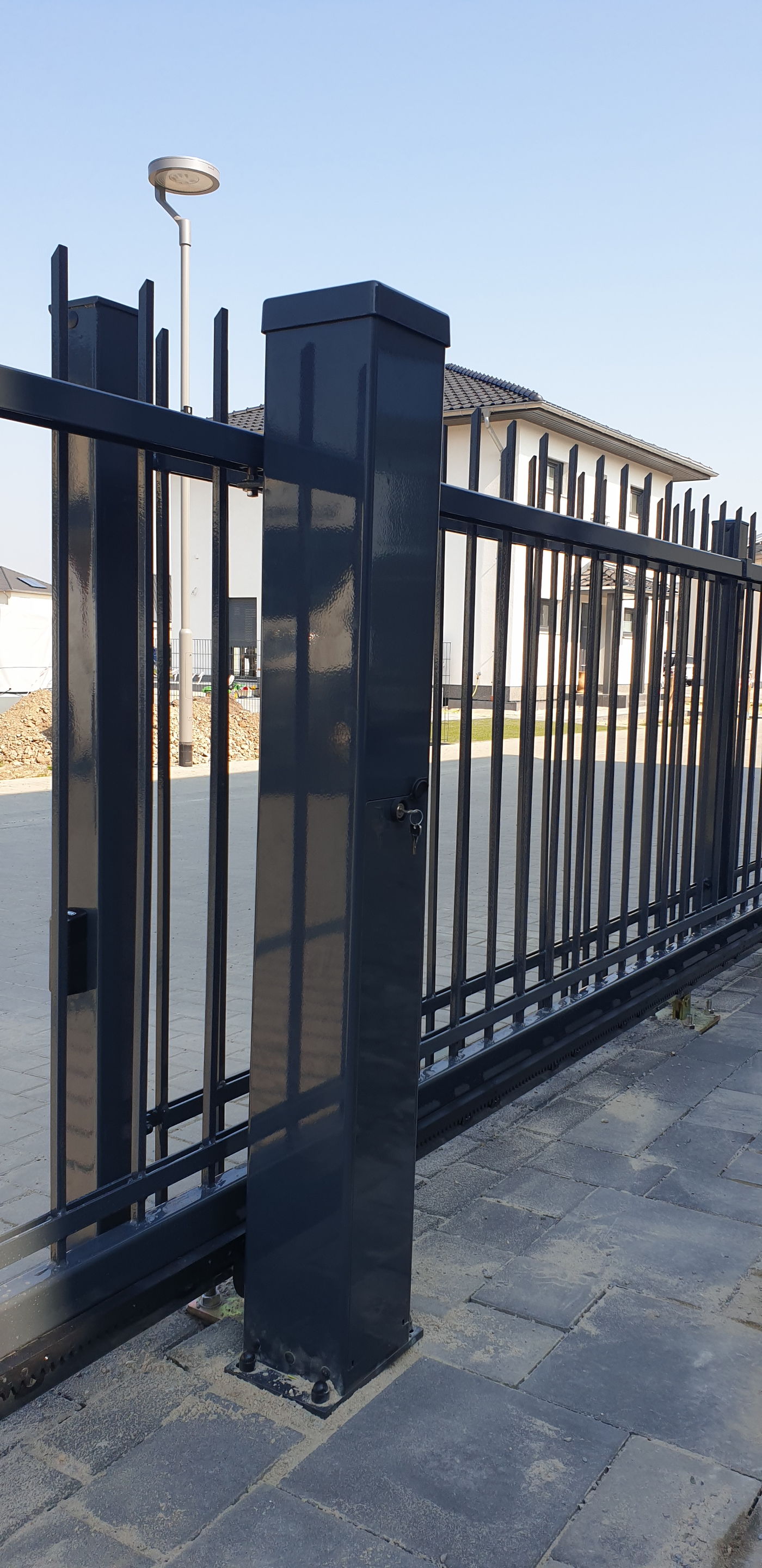 Die Anlage ist 28,50 m lang und besteht aus einem 6,00 m breiten Schiebetor, einer 1,00 m breiten Pforte und zehn Zaunfeldern. Der Zaun ist 1,20 m hoch.