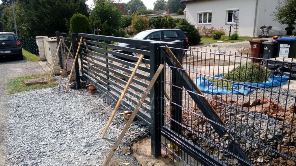 Es handelt sich hier um eine günstige Kombination von einem Doppelstabmattenanzaun mit einem Schmiedetor und einer Schmiedepforte. Das Tor und die Pforte wurden nach einem modernen, schlichten und sehr robusten Muster ausgeführt.